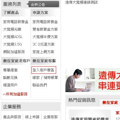 《步驟一》 至遠傳大寬頻官網http://www.seed.net.tw/ 點選數位家庭客服下方的『登入客戶專區』。